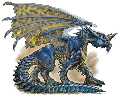 La cabeza del dragón se parece decididamente a una calavera gracias a sus ojos profundos y su abertura nasal ancha y plana. Cuenta con cuernos curvados hacia adelante y una cresta espinal que alcanza su punto máximo justo detrás de la cabeza y se estrecha aproximadamente tres cuartas partes del camino hacia el cuello. Un ácido El olor rodea al dragón, cuyas escamas son en su mayoría de ébano opaco y gris oscuro. Los dragones negros son malhumorados, astutos y malévolos, características que se reflejan en sus rostros astutos y siniestros. Los dragones negros a veces se conocen como dragones calavera debido a sus caras esqueléticas. A la impresión esquelética se suma el deterioro gradual de la piel alrededor de la base del cuerno y los pómulos. Este deterioro aumenta con la edad y no daña al dragón. Al eclosionar, un negro Las escamas del dragón son delgadas, pequeñas y brillantes. A medida que el dragón envejece, se vuelven más grandes, más gruesos y más apagados, lo que le ayuda a camuflarse en pantanos y marismas. Los dragones negros se esconden en cuevas grandes y húmedas y cavernas subterráneas de varias cámaras. Huelen a vegetación podrida y agua fétida, con un olor ácido voz baja. Los dragones más viejos ocultan la entrada a sus guaridas utilizando el crecimiento de las plantas. Los dragones negros se alimentan principalmente de peces, moluscos y otras especies acuáticas. Criaturas. También cazan carne roja, pero les gusta "encurtirla" dejándola reposar en estanques dentro de la guarida durante días antes de comerla. A los dragones negros les gustan especialmente las monedas. Los dragones más viejos a veces capturan e interrogan a los humanoides sobre las reservas de oro, plata y platino monedas antes de matarlos. CombateLos dragones negros prefieren emboscar a sus objetivos, usando su entorno como cobertura. Al luchar en pantanos densamente boscosos y pantanos, tratan de permanecer en el agua o en el suelo; Los árboles y las copas frondosas limitan su maniobrabilidad aérea. Cuando es superado, un dragón negro intenta volar fuera de la vista, para no dejar huellas, y esconderse en un estanque o ciénaga profunda. Arma de aliento (Sb): Un dragón negro tiene un tipo de arma de aliento, una línea de ácido. Respiración acuática (Ex): Un dragón negro puede respirar bajo el agua indefinidamente y puede usar libremente su arma de aliento, hechizos y otras habilidades mientras está sumergido. Agua corrupta (Esp): Una vez al día, un dragón negro adulto o mayor puede estancar 10 pies cúbicos de agua, lo que hace que se quede quieto, sucio y incapaz de sustentar la vida animal. La habilidad estropea los líquidos que contienen agua. Objetos mágicos (como pociones) y objetos en posesión de una criatura debe tener éxito en una salvación de Voluntad (CD igual a la de la espantosa presencia del dragón) o ensuciarse. Esta habilidad es el equivalente a un Hechizo de nivel 1. Su alcance es igual al de la espantosa presencia del dragón. Reptiles amuletos (Esp): Un gran dragón negro wyrm puede usar esta habilidad tres veces al día. Funciona como un hechizo de encantamiento masivo que solo afecta animales reptiles. El dragón puede comunicarse con cualquier reptil encantado como si lanzara un hechizo para hablar con los animales. Esta habilidad es el equivalente de un hechizo de 1er nivel. Otras habilidades similares a hechizos: 3/día: oscuridad (juvenil o mayor; radio de 10 pies por categoría de edad), plaga de insectos (antigua o más antigua); 1/día: crecimiento de la planta (vieja o vieja). Habilidades: Esconder, Muévete en silencio, and Nadar are considered class skills for black dragons. DRAGÓN AZUL Dragón (Tierra)