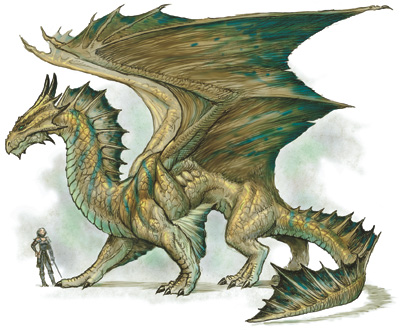 La cabeza del dragón tiene una placa masiva en la frente y cuernos en forma de cuchilla en la barbilla. Un volante corre a lo largo del cuello, y El dragón tiene alas parecidas a las de una manta. El dragón huele a arena tostada por el sol y sus escamas brillan como latón pulido. Los dragones de bronce son notoriamente habladores. Pueden tener información útil, pero por lo general la comparten solo después de largas divagaciones e insinuaciones para un regalo. Al nacer, las escamas de un dragón de latón son de un marrón opaco y moteado. A medida que el dragón envejece, las escamas se vuelven más cobrizas hasta que alcanzan un Aspecto cálido y bruñido. Las grandes placas de la cabeza de un dragón de bronce son lisas y metálicas, y luce cuernos afilados en la barbilla que se vuelven más afilados con edad. Las alas y los volantes son de color verde moteado hacia los bordes, oscureciéndose con la edad. A medida que el dragón envejece, sus pupilas se desvanecen hasta que los ojos se asemejan orbes de metal fundido. A los dragones de latón les encanta el calor intenso y seco y pasan la mayor parte del tiempo tomando el sol del desierto. Se acompañan de un sabor metálico o arenoso olor. Descansan en cuevas altas, preferiblemente orientadas hacia el este para disfrutar del calor de la mañana, y sus territorios siempre contienen varios lugares donde pueden Toma el sol y atrapa a los viajeros incautos en la conversación. Los dragones de latón pueden comer casi cualquier cosa si surge la necesidad, pero normalmente consumen muy poco. Son capaces de nutrirse de el rocío de la mañana, un bien raro en su hábitat, y se les ha visto levantándolo cuidadosamente de las plantas con sus largas lenguas. Debido a que comparten hábitats similares, los dragones azules son los peores enemigos de los dragones de bronce. Los azules más grandes tienen la ventaja en el uno contra uno enfrentamientos, por lo que los dragones de bronce generalmente intentan evadirlos hasta que puedan reunir a sus vecinos para un ataque masivo. CombateLos dragones de bronce prefieren hablar que pelear. Si una criatura inteligente intenta irse sin entablar una conversación, el dragón puede forzar el cumplimiento en un ataque de enojo, usando la sugestión o una dosis de gas para dormir. Una criatura puesta a dormir puede despertarse y encontrarse inmovilizada o enterrada hasta el cuello en la arena hasta que se apague la sed del dragón por la charla trivial. Cuando se enfrentan a un peligro real, los dragones de bronce más jóvenes salen volando de vista, luego escóndete cavando en la arena. Los dragones más viejos rechazan esta estratagema, pero aún prefieren tener la ventaja en el combate. Arma de aliento (Sb): Un dragón de latón tiene dos tipos de arma de aliento, una línea de fuego y un cono de sueño. Las criaturas dentro del cono deben tener éxito en un Guardará o se quedará dormido, independientemente de HD, durante 1d6 rondas más 1 ronda por categoría de edad del dragón. Habilidades similares a hechizos: A voluntad: habla con los animales; 3/día: soporta elementos (juveniles o mayores; radio 10 pies x edad del dragón) categoría); 1/día: sugerencia (adulto o mayor), controlar los vientos (viejos o viejos), controlar el clima (antiguo o viejo). Invocar a Djinni (Esp): Esta habilidad, utilizable por un gran dragón de bronce wyrm, funciona como un hechizo de invocación de monstruos, excepto que invoca uno djinni. Esta habilidad es el equivalente a un hechizo de nivel 7. Habilidades: Farol, Recopilar información, and Supervivencia are considered class skills for brass dragons. DRAGÓN DE BRONCE Dragón (Agua)