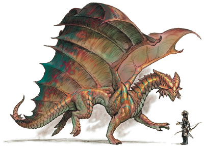 Los verdaderos dragones son criaturas aladas, parecidas a reptiles, de antiguo linaje. Son conocidos y temidos por su tamaño, destreza física y habilidades mágicas. Los dragones más antiguos se encuentran entre las criaturas más poderosas del mundo. Las variedades conocidas de dragones verdaderos (a diferencia de otras criaturas que tienen el tipo de dragón) se dividen en dos grandes categorías: cromáticas y metálico. Los dragones cromáticos son negros, azules, verdes, rojos y blancos; Todos son malvados y extremadamente feroces. Los dragones metálicos son de latón, bronce, cobre, oro y plata; Todos son buenos, por lo general nobles, y muy respetados por los sabios. Todos los dragones verdaderos adquieren más habilidades y mayor poder a medida que envejecen. (Otras criaturas que tienen el tipo dragón no lo tienen). Su longitud oscila entre varios pies después de eclosionar a más de 100 pies después de alcanzar el estado de gran wyrm. El tamaño de un dragón en particular varía según la edad y variedad. Aunque son depredadores temibles, los dragones hurgan cuando es necesario y pueden comer casi cualquier cosa si tienen suficiente hambre. El de un dragón El metabolismo funciona como un horno altamente eficiente y puede metabolizar incluso material inorgánico. Algunos dragones han desarrollado un gusto por este tipo de tarifa. Aunque los objetivos e ideales varían entre las variedades, todos los dragones son codiciosos. Les gusta acumular riquezas, coleccionando montones de monedas y reuniendo tantas gemas, joyas y objetos mágicos como sea posible. Aquellos con grandes tesoros son reacios a dejarlos por mucho tiempo, aventurándose fuera de sus guaridas solo para patrullar el área inmediata o para conseguir comida. Para los dragones, no hay tal cosa como suficiente tesoro. Es agradable a la vista, y se regodean en su resplandor. A los dragones les gusta hacer camas con sus tesoros, dando forma a rincones y montículos para que se ajusten a sus cuerpos. En el momento en que un dragón madura hasta la edad de los grandes wyrm, cientos de gemas y monedas pueden estar incrustadas en su piel. Todos los dragones hablan dracónico. COMBATEUn dragón ataca con sus poderosas garras y mordiscos, y también puede usar un arma de aliento y ataques físicos especiales, dependiendo de su tamaño. Prefiere luchar en el ala, manteniéndose fuera de su alcance hasta que haya desgastado al enemigo con ataques a distancia. Los dragones más viejos e inteligentes son Experto en evaluar a la oposición y eliminar primero a los enemigos más peligrosos (o evitarlos mientras elimina a los enemigos más débiles). La siguiente tabla proporciona estadísticas de espacio y alcance para dragones de varios tamaños, además de las armas naturales que puede emplear un dragón de cierto tamaño y el daño que infligen esos ataques. Morder: Los ataques de mordedura infligen el daño indicado más la bonificación de fuerza del dragón. Un dragón también puede usar su mordedura para arrebatar a sus oponentes si tiene la hazaña Snatch. Garra: Los ataques de garra infligen el daño indicado más 1/2 la bonificación de fuerza del dragón (redondea hacia abajo). El dragón también puede usar sus garras para arrebatar a los oponentes si tiene la proeza Snatch. Los ataques de garra son ataques secundarios, que requieren una penalización de -5 en la tirada de ataque. (Muchos dragones eligen la proeza de ataque múltiple para reducir esta penalización a -2). Ala: El dragón puede golpear a los oponentes con sus alas, incluso cuando vuela. Los ataques de alas infligen el daño indicado más 1/2 el daño del dragón Bonificación de fuerza (redondear hacia abajo) y se tratan como ataques secundarios. Bofetada de cola: El dragón puede abofetear a un oponente en cada ronda con su cola. Un golpe en la cola inflige el daño indicado más 1-1/2 veces el daño Bonificación de Fuerza del dragón (redondea hacia abajo) y se trata como un ataque secundario. Aplastamiento (Ex): This special attack allows a flying or jumping dragon of at least Huge size to land on opponents as a standard action, using its whole body to crush them. Crush attacks are effective only against opponents three or more size categories smaller than the dragon (though it can attempt normal Invadido or gafa attacks against larger opponents). Un ataque de aplastamiento afecta a tantas criaturas como puedan caber debajo del cuerpo del dragón. Las criaturas en el área afectada deben tener éxito en una salvación de Reflejos (CD igual a la del arma de aliento de dragón) o ser inmovilizado, recibiendo automáticamente daño contundente durante la siguiente ronda a menos que el dragón se aleja de ellos. Si el dragón decide mantener el pin, trátalo como un ataque de agarre normal. Los oponentes inmovilizados reciben daño del aplastamiento cada uno redondo si no escapan. Un ataque de aplastamiento inflige el daño indicado más 1-1/2 veces la bonificación de fuerza del dragón (redondea hacia abajo). Barrido de cola (Ex): Este ataque especial permite que un dragón de al menos tamaño gigantesco barre con su cola como acción estándar. El barrido afecta a un semicírculo con un radio de 30 pies (o 40 pies para un dragón colosal), que se extiende desde una intersección en el borde de la espacio en cualquier dirección. Las criaturas dentro del área barrida se ven afectadas si son cuatro o más categorías de tamaño más pequeñas que el dragón. Un barrido de cola inflige automáticamente el daño indicado más 1-1/2 veces la bonificación de fuerza del dragón (redondea hacia abajo). Las criaturas afectadas pueden intentar guardar reflejos para recibir la mitad del daño (CD igual a la del arma de aliento de dragón). Lidiando: Los dragones no favorecen los ataques de agarre, aunque su ataque de aplastamiento (y la hazaña de arrebato, si lo saben) usan reglas de agarre normales. A dragon can always use its breath weapon while gr