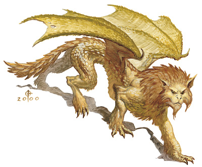 Parte león gigante y parte dragón, la criatura tiene un par de pequeñas alas de color latón que brotan de sus hombros. Está cubierto con escamas de color bronce, y su melena es espesa y áspera. Poseedor de algunas de las cualidades más peligrosas de un león y un dragón de bronce, el dragonne es un cazador vicioso y mortal. Los dragones no son necesariamente agresivos con los extraños. Su reputación como devoradores despiadados de viajeros indefensos es más bien el producto de ignorancia que hechos bien investigados. Un dragón casi siempre ataca a una criatura que invade su guarida o amenaza su territorio, por lo que los aventureros que tropezar con su cueva o los colonos que intentan acampar en la zona suelen ser objeto de represalias feroces e inmediatas. Los que no Amenazar la guarida de los dragones o simplemente pasar por su territorio suelen ser dejados solos. Los dragones prefieren animales de manada como las cabras para comer, especialmente porque no se defienden tan ferozmente como los humanoides. Atacan a los humanoides solo si no hay otro juego disponible. Un dragón posee enormes garras y colmillos, y ojos grandes, generalmente del color de sus escamas. Un dragón mide aproximadamente 12 pies de largo y pesa alrededor de 700 Libras. Los dragones hablan dracónico. COMBATELas alas de un dragón son útiles solo para vuelos cortos, transportando a la criatura durante 10 a 30 minutos a la vez. Sin embargo, usa sus alas de manera efectiva en la batalla. Si los oponentes intentan cargarlo o rodearlo, el dragón simplemente se eleva en el aire y encuentra una forma más defendible posición. Abalanzarse (Ex): Si un dragón carga, puede realizar un ataque completo en la misma ronda. Rugido (Sb): Un dragón puede soltar un rugido devastador cada 1d4 rondas. Todas las criaturas, excepto los dragones en un radio de 120 pies, deben tener éxito en un CD 15 Ahorrará o se fatigará. Aquellos a menos de 30 pies que fallan sus salvamentos se agotan. El CD guardado se basa en Charisma. Habilidades: Los dragones tienen una bonificación racial de +4 en las pruebas de escucha y puntualización. Capacidad de carga: Una carga ligera para un dragón es de hasta 348 libras; una carga mediana, de 349 a 699 libras, y una carga pesada, de 700 a 1,050 Libras.