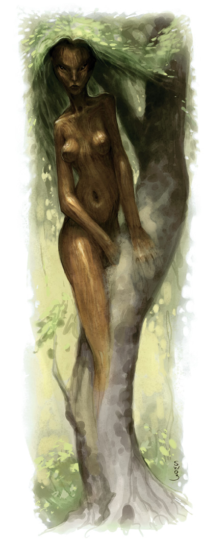 La criatura florece de la corteza del árbol antiguo, al principio aparece como una nueva rama antes de solidificarse en un forma femenina. Tiene un aspecto salvaje e insondable en sus grandes ojos almendrados, y su cabello tiene una textura pronunciada y frondosa, mientras que su piel se ve como madera bruñida. Las dríadas son entidades salvajes y misteriosas que se encuentran en las profundidades de bosques aislados. Defienden los árboles de cualquiera que los derribe y a veces entran en conflicto con los humanos y otras personas que toman madera de los bosques. Se sabe que las dríadas encantan a los aventureros para que les ayuden a defender sus hogares o Cazando a los enemigos del bosque, incluso si esos enemigos son leñadores y leñadores humanos. Las dríadas siguen siendo un misterio incluso para otros seres del bosque. Los cuentos hablan de dríades que se encapricharon de hombres elfos o humanos apuestos, encantados y los mantuvo cautivos. Pero dado que las dríadas rara vez se asocian con alguien fuera de su propia especie, estas historias pueden ser puramente apócrifas. Las dríadas son Es más probable que atrapen a los intrusos y luego envíen a sus "invitados" encantados a lidiar con amenazas que las dríades no pueden manejar. Las delicadas facciones de una dríade son muy parecidas a las de una elfa hembra, aunque su carne es como corteza o madera fina, y su cabello es como un dosel de hojas que cambia de color con las estaciones. Aunque generalmente son solitarios, en raras ocasiones se han encontrado hasta siete dríades en un solo lugar. Las dríadas hablan común, élfico y silvano COMBATETímidas, inteligentes y resueltas, las dríades son tan escurridizas como atractivas: evitan el combate físico y rara vez se ven a menos que ellos deseen serlo. Si se siente amenazado, o necesita un aliado, una dríade usa el encantamiento o la sugestión, intentando obtener el control de los atacantes que podría ayudar más contra el resto. Cualquier ataque a su árbol, sin embargo, provoca que la dríade se defienda frenéticamente. Habilidades similares a hechizos: A voluntad: enredar (CD 13), hablar con plantas, forma de árbol; 3/día— persona encantadora (DC 13), sueño profundo (DC 15), zancada de árbol; 1/día—sugerencia (CD 15). Nivel de lanzador 6º. Los CD de guardado se basan en Wisdom. Dependiente del árbol (Sb): Cada dríade está místicamente ligada a un solo roble enorme y nunca debe alejarse más de 300 yardas de él. Cualquier que se enferman y mueren en 4d6 horas. El roble de una dríade no irradia magia. Empatía salvaje (Ex): Este poder funciona como la característica de clase de empatía salvaje del druida, excepto que la dríade tiene una bonificación racial de +6 en el comprobar.